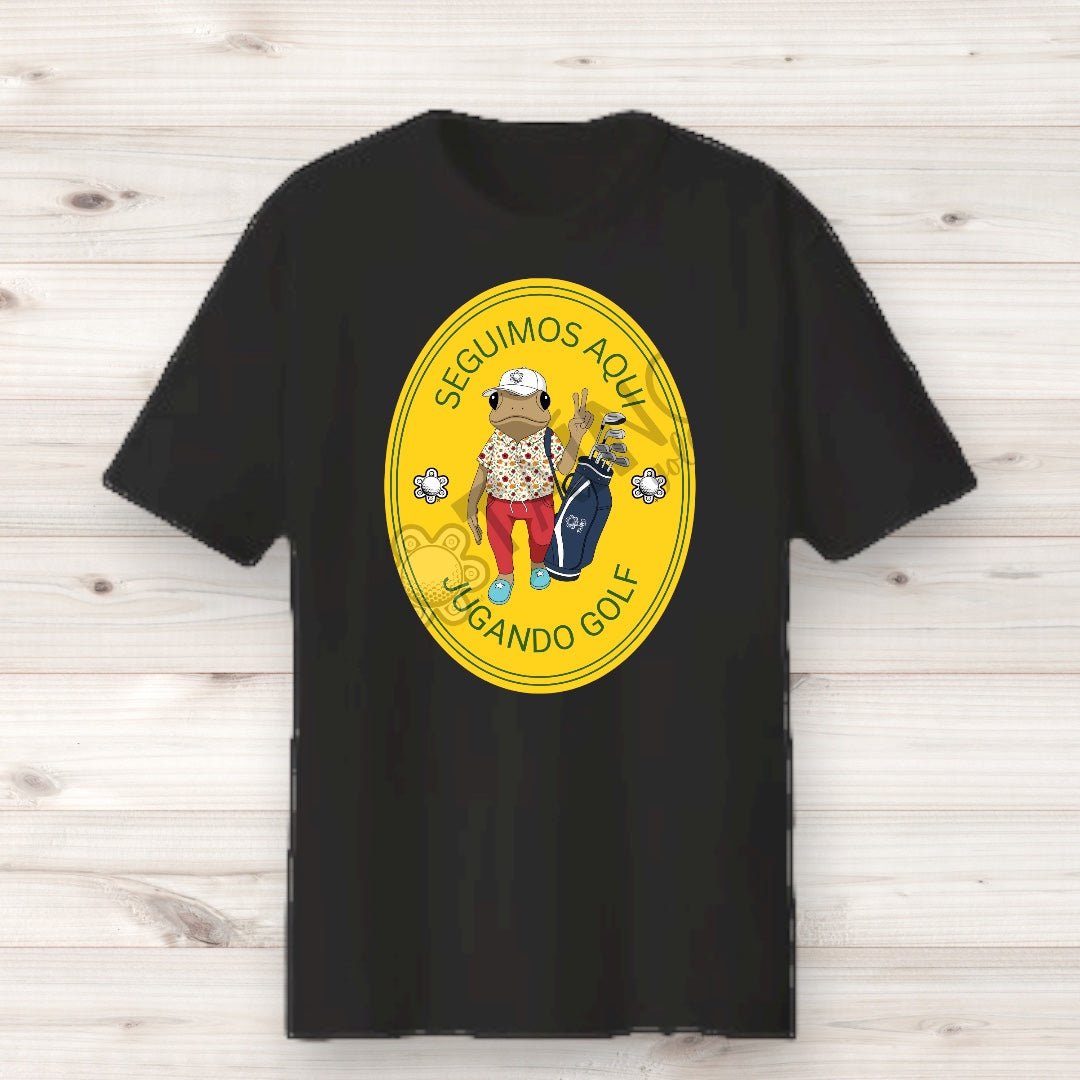 Exclusive “Seguimos Aquí Jugando Golf” graphic featuring the concho frog
