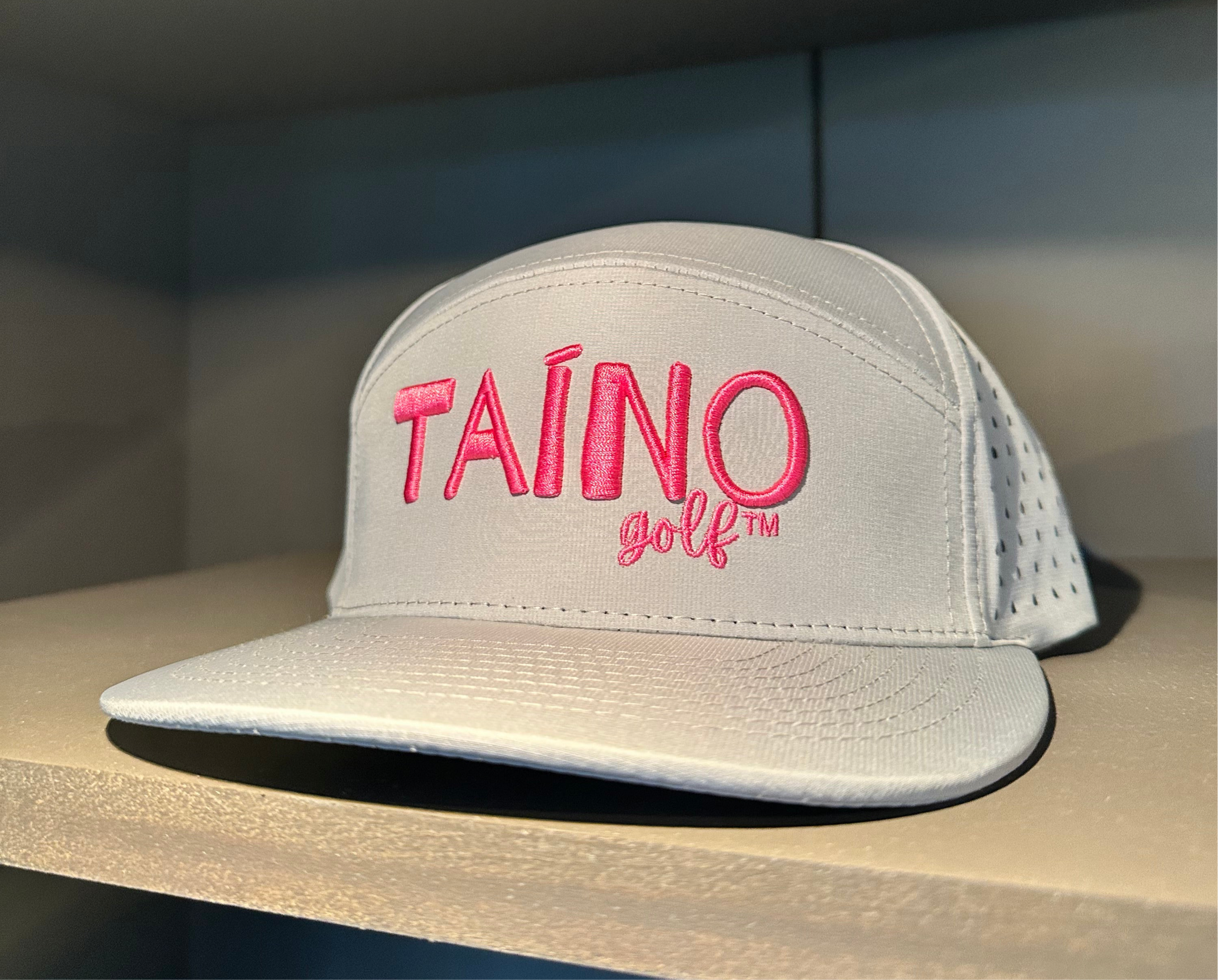 - Horizontal front panel with pink “Taino Golf” embroidery